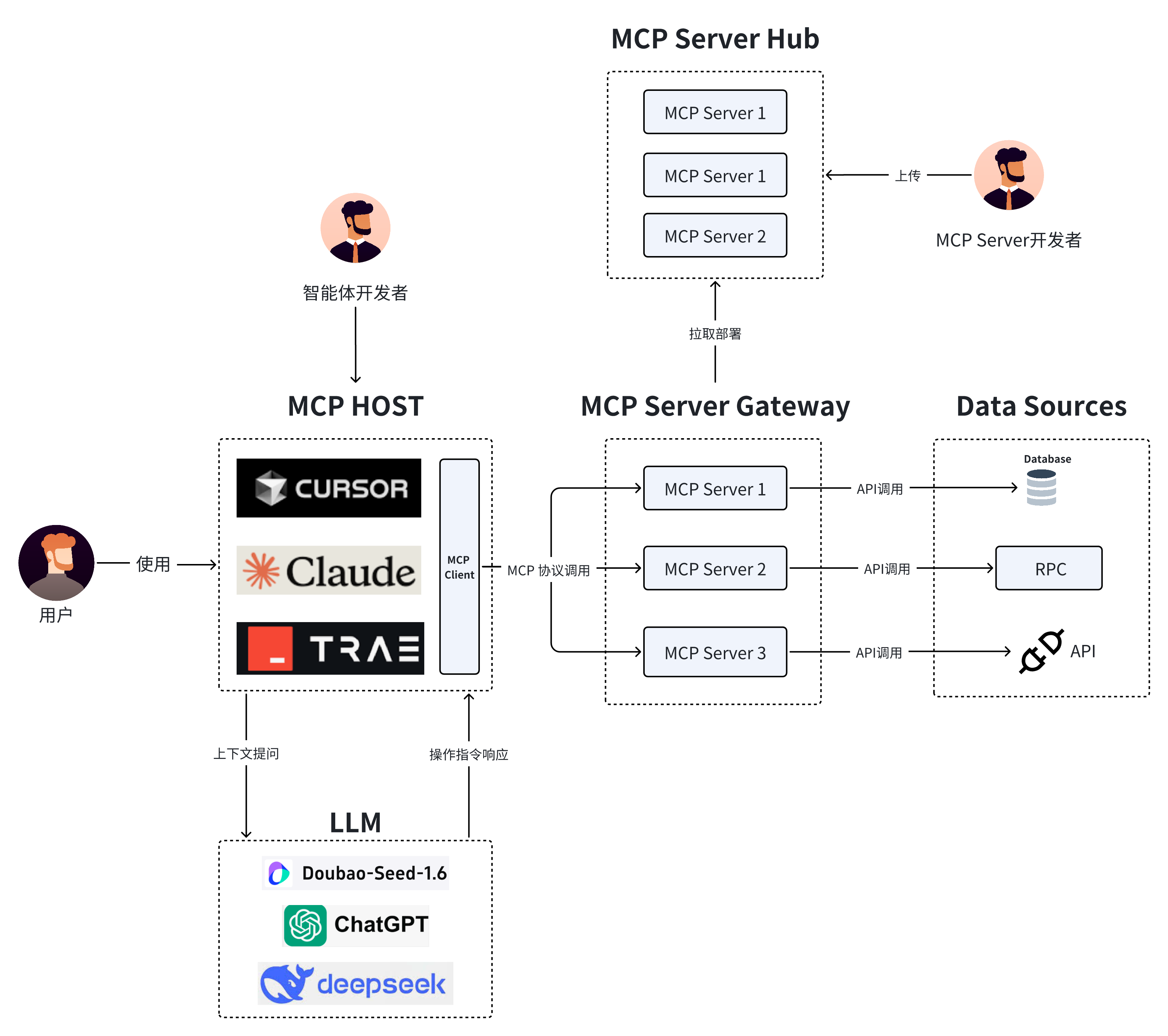 | MCP 服务端网关(MCP Server Gateway) | MCP Server统一对外的网关,用于接受MCP Client发送的请求,MCP Server Gateway可以是单一的MCP Server,也可以是多MCP Server |