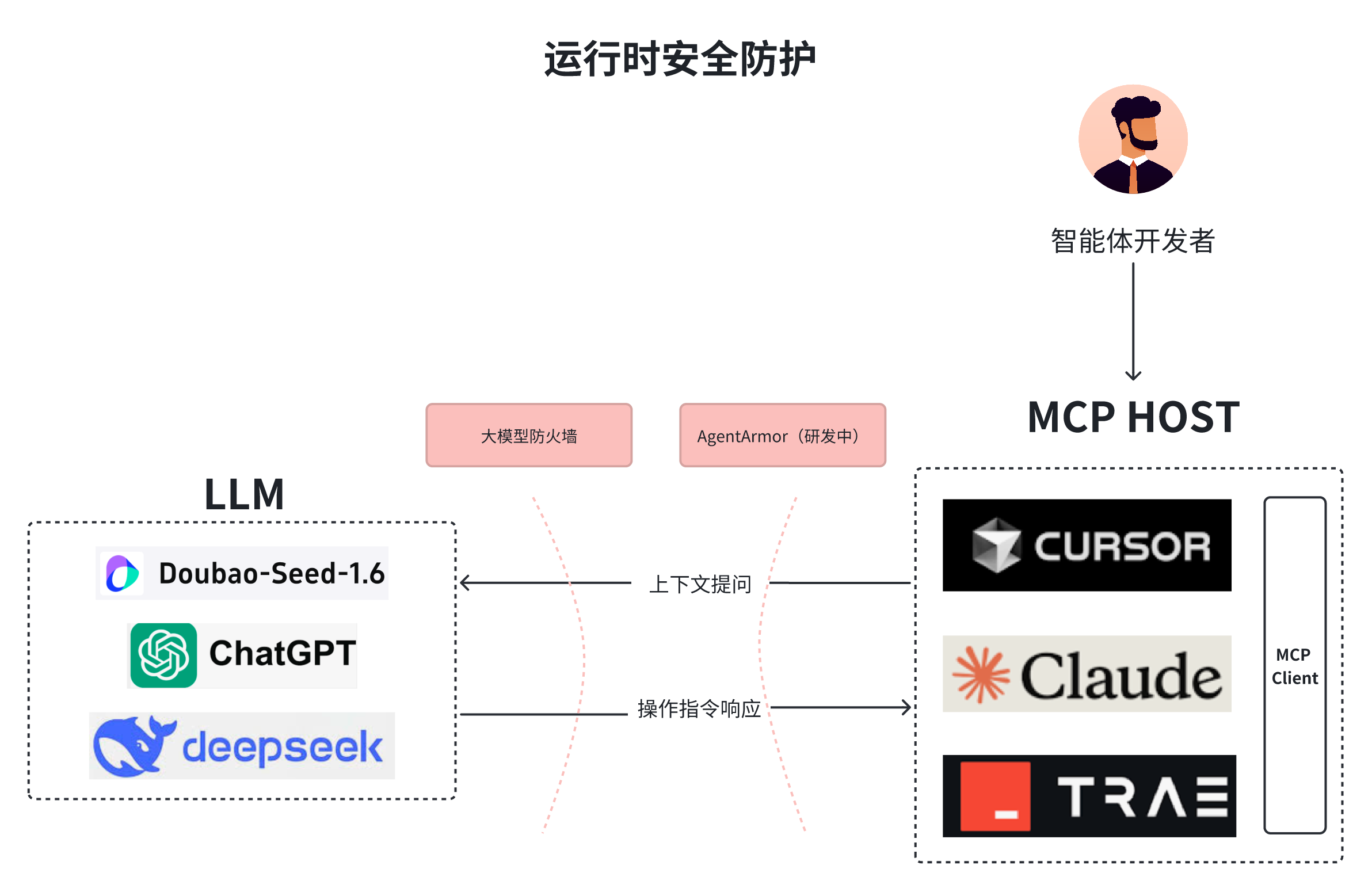 运行时安全防护:提供两款防护能力,分别用于保护模型和Agent,防止提示词注入越狱以及MCP HOST出现非预期行为,在运行时检测并拦截危险输入。
