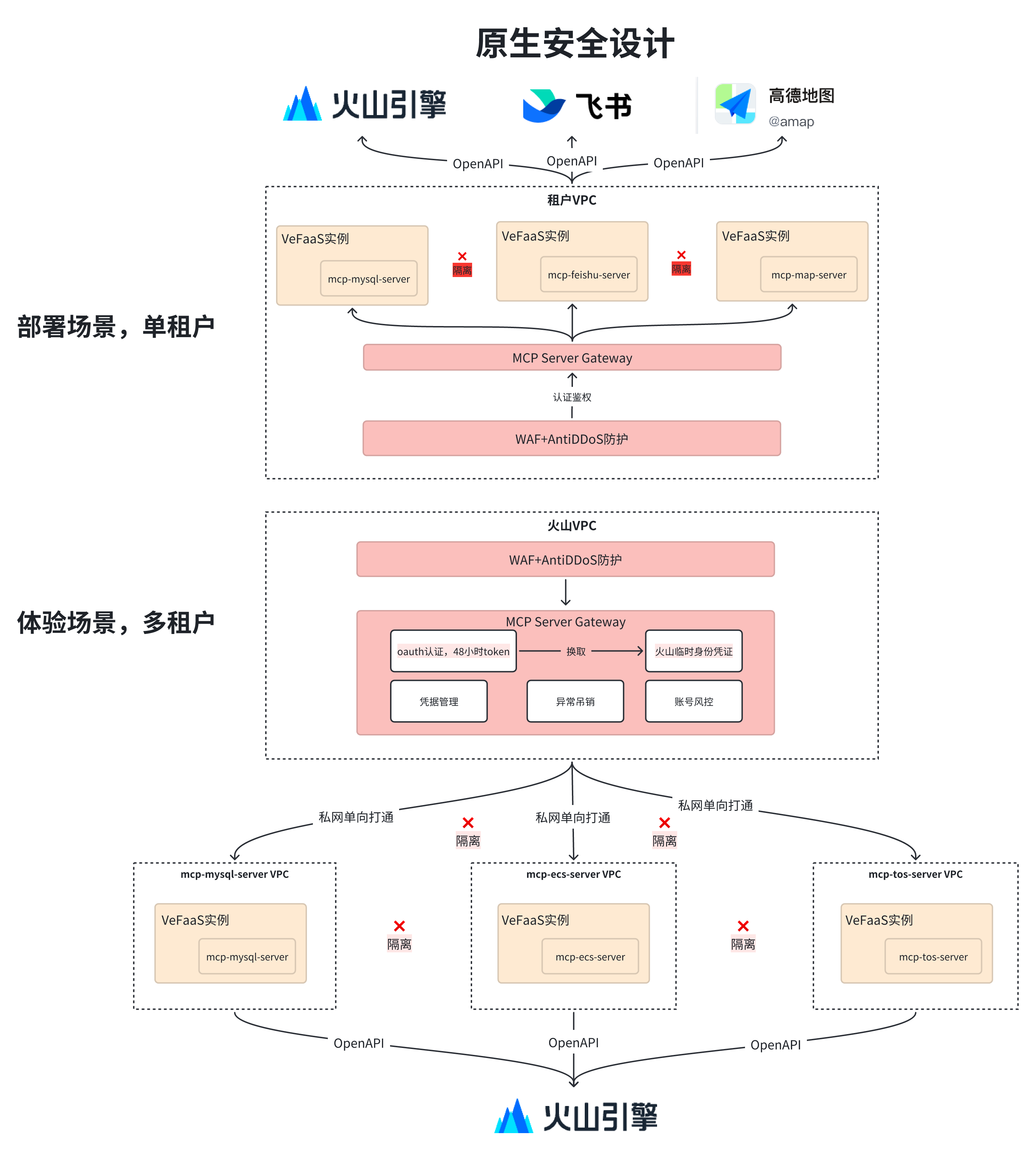 原生安全设计:定义了体验场景和部署场景。在体验场景中,采用OAuth授权的方式结合火山临时身份凭证,实现多租户隔离,并将OAuth token的有效期限制为48小时。在部署场景中,将一整套MCP Server Gateway和MCP Server部署到客户的VPC中,支持对MCP Gateway访问控制进行配置。