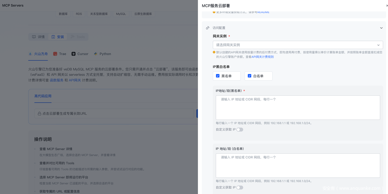 - · 禁止高危操作:对火山一方的MCP Server我们对提供的工具能力进行严格审查,默认禁止高危控制面操作,以避免出现非预期的删改操作。