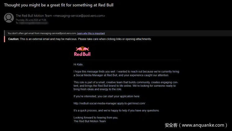 钓鱼攻击依然是网络安全领域最持久的威胁之一——并非因为缺乏技术防御手段,而是攻击者不断推陈出新的手法。Evalian安全运营中心(SOC)近日揭露了一起具有高度迷惑性和隐蔽性的钓鱼活动。该活动借助合法服务、伪造知名品牌,以“红牛招聘”为幌子,绕过自动化安全系统,成功潜入受害者邮箱。