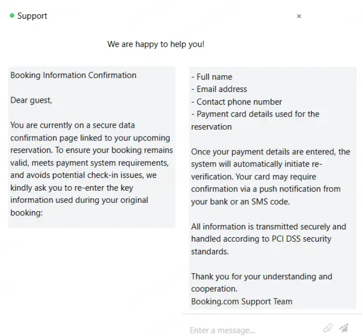 据悉,攻击者通过Booking.com系统中的真实预订聊天界面发送警示信息,如“您的预订存在风险”,诱导用户点击链接并更新信用卡信息,以避免订单被取消。由于Booking.com会将站内消息同步至用户邮箱,受害者实际上在两个渠道同时收到了钓鱼信息,进一步提升了诈骗成功率。