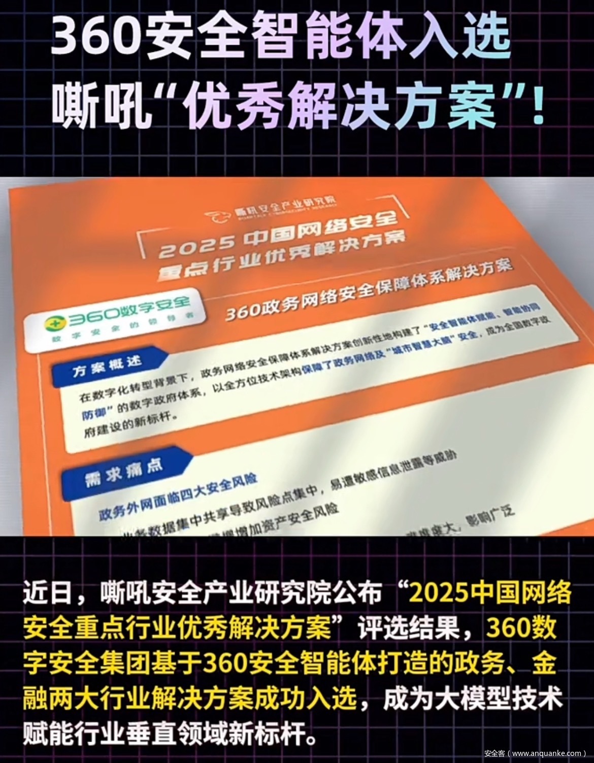6月,360基于安全智能体打造的政务、金融两大行业解决方案成功入选嘶吼安全产业研究院“2025中国网络安全重点行业优秀解决方案”,成为大模型技术赋能行业垂直领域新标杆。