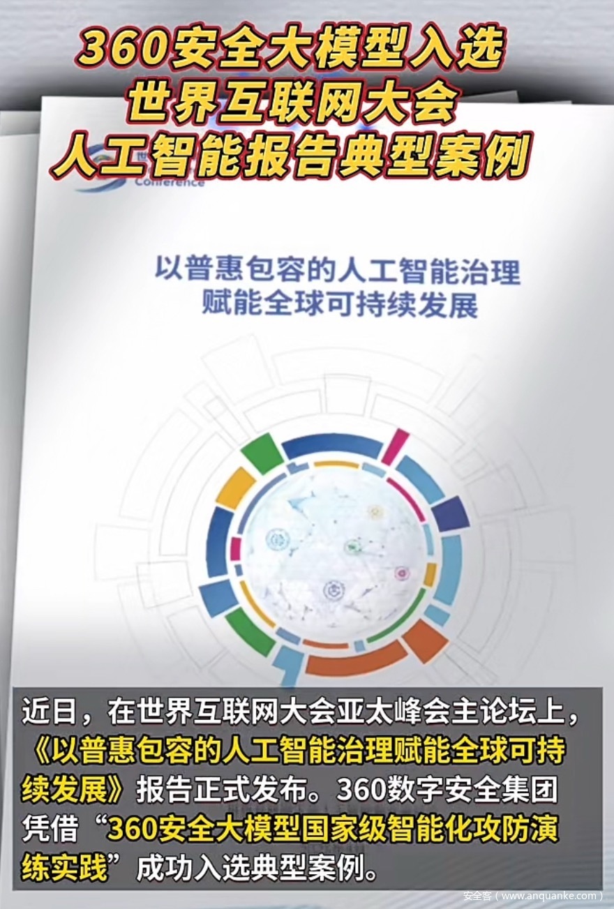 4月,在世界互联网大会发布《以普惠包容的人工智能治理赋能全球可持续发展》报告,360凭借“360安全大模型国家级智能化攻防演练实践”成功入选典型案例。