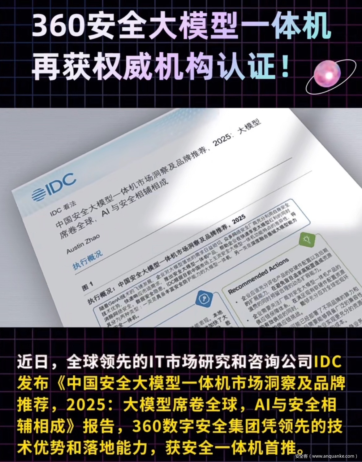 6月,IDC《中国安全大模型一体机市场洞察及品牌推荐,2025:大模型席卷全球,AI与安全相辅相成》360凭借领先的技术优势和落地能力,获安全大模型一体机首推。