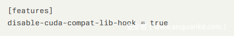 针对使用 NVIDIA Container Runtime 的用户,可通过编辑配置文件 /etc/nvidia-container-toolkit/config.toml,将 features.disable-cuda-compat-lib-hook 功能项设置为 true 来禁用相关功能。