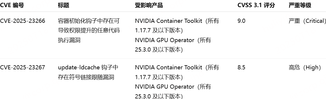 本次修复的漏洞编号为 CVE-2025-23266 和 CVE-2025-23267,影响所有运行 NVIDIA Container Toolkit ≤ 1.17.7 版本以及 GPU Operator ≤ 25.3.0 版本的系统平台。