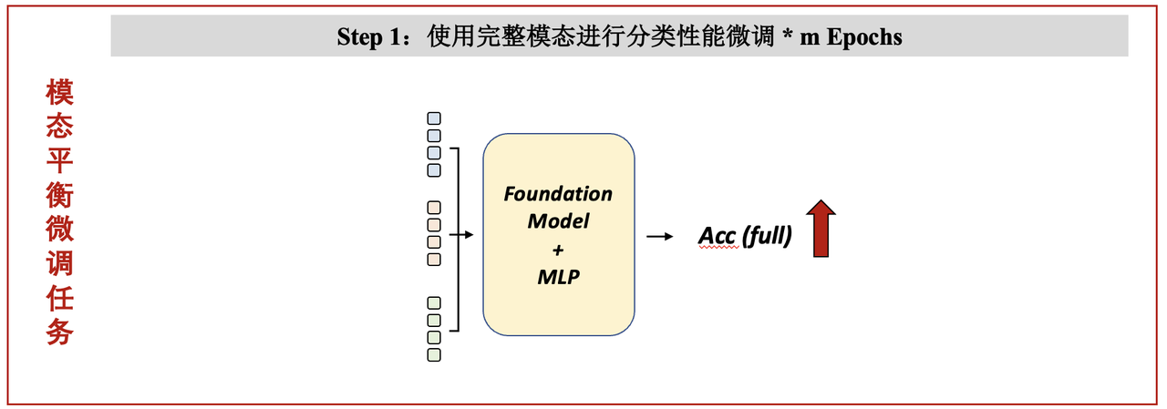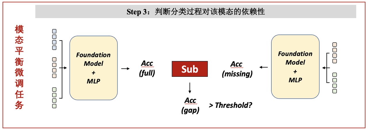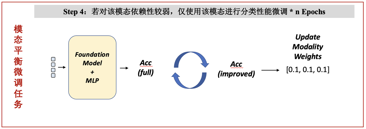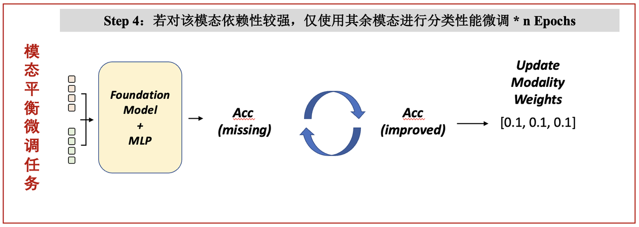· Step 4(模态平衡): 若移除模态 x 后准确率损失超过阈值(5%),说明对模态 x 依赖较强,为防止过度依赖、加强对其他模态的使用,在去除模态 x 的情况下微调训练 n 个 Epoch