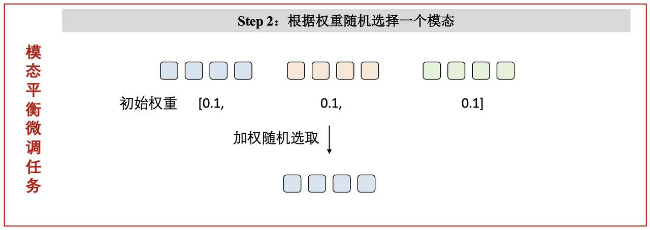 · Step 2(随机模态挑选): 平等初始化各个模态对分类结果的影响权重,并按权重随机挑选一个模态 x