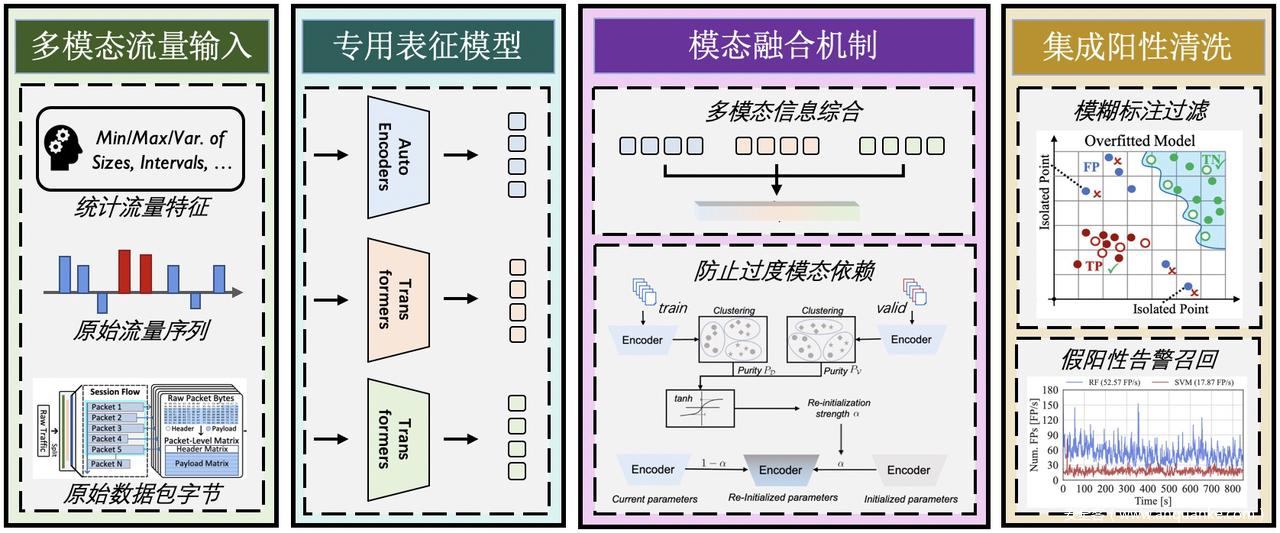 我们构建了一套以多模态流量表征+模态融合与平衡+集成阳性清洗为核心的多模态检测框架: