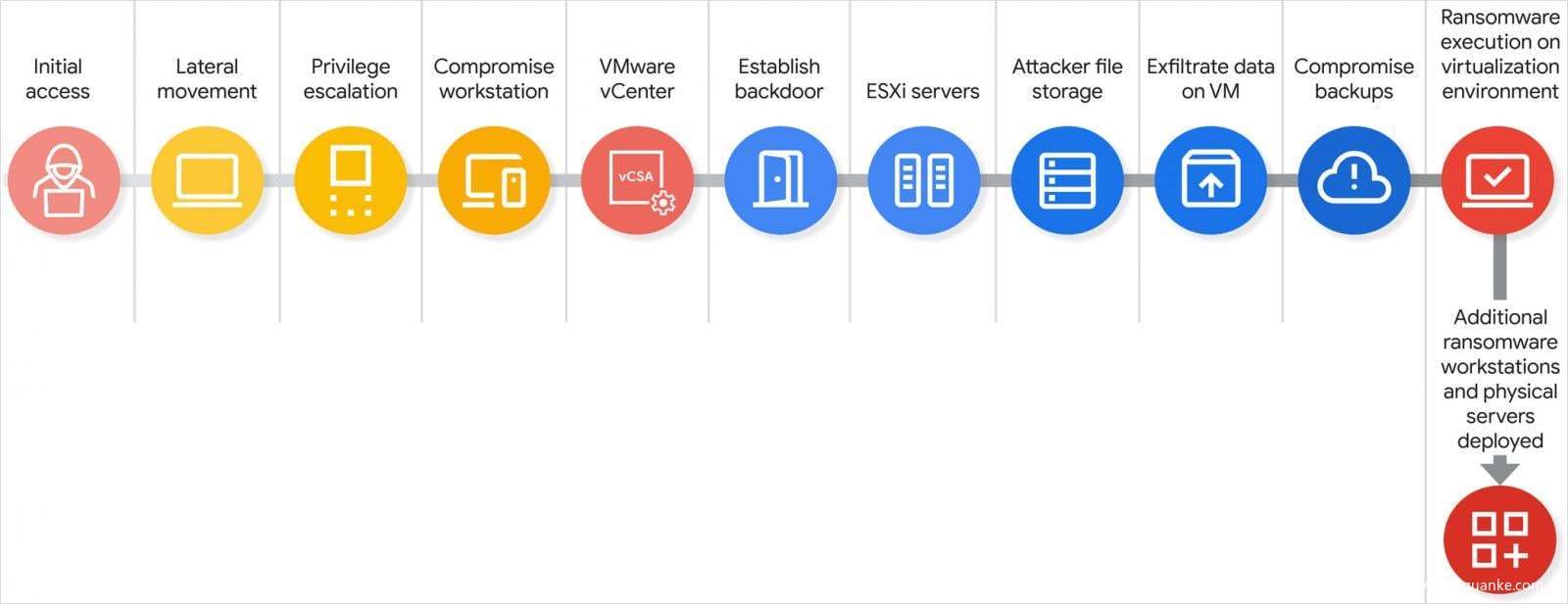 其中一个原因可能是攻击者发现VMware基础设施通常对组织而言理解不深,因此防御措施不够强大。