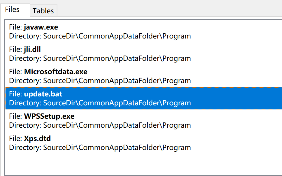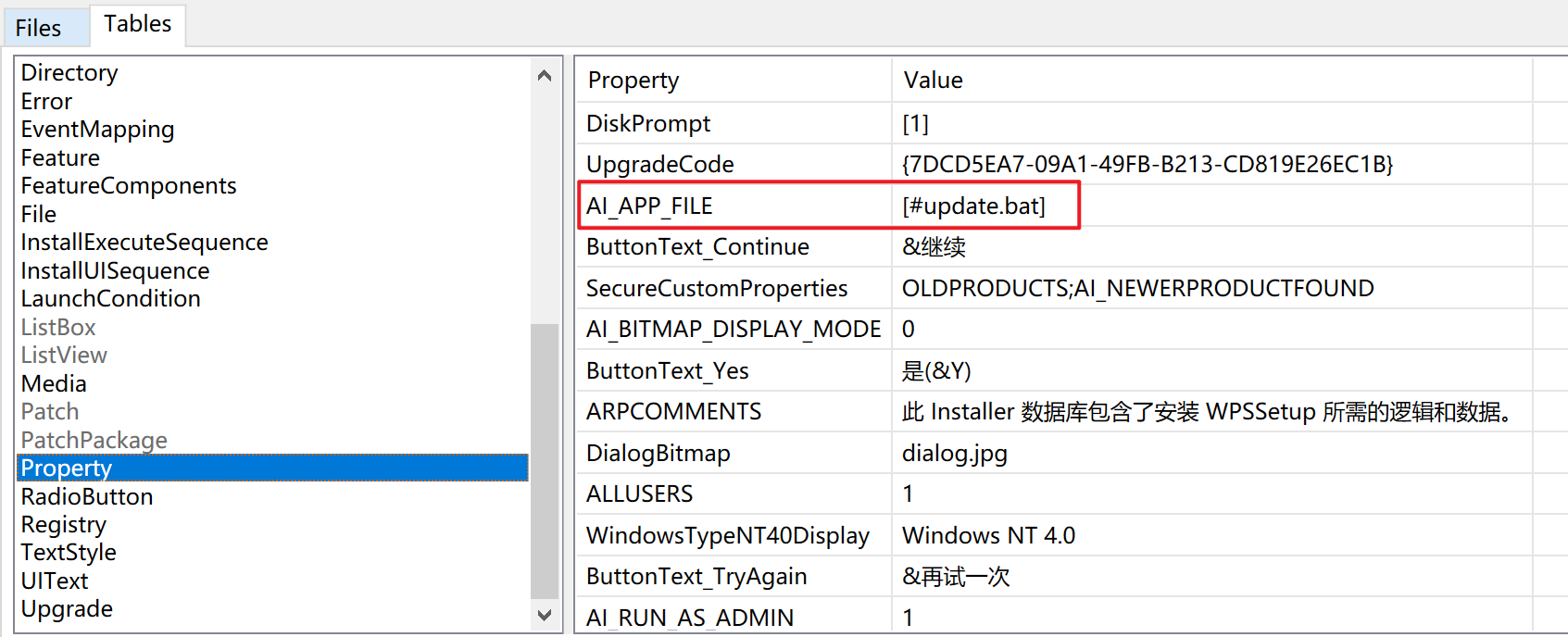 msi运行后加载aicustact.dll,该文件的主要功能是用于加载攻击者指定的文件,需要运行的文件在Proprety表中进行体现: