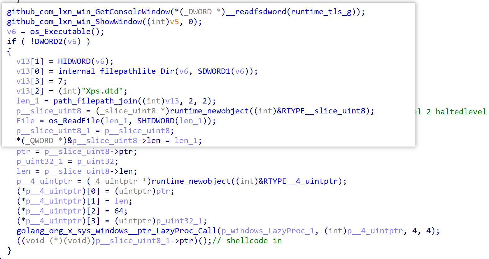 Microsoftdata.exe通过模仿官方程序命名,增加信任度,由Golang编写而成。运行后读取同目录下的Xps.dtd,并加载执行: