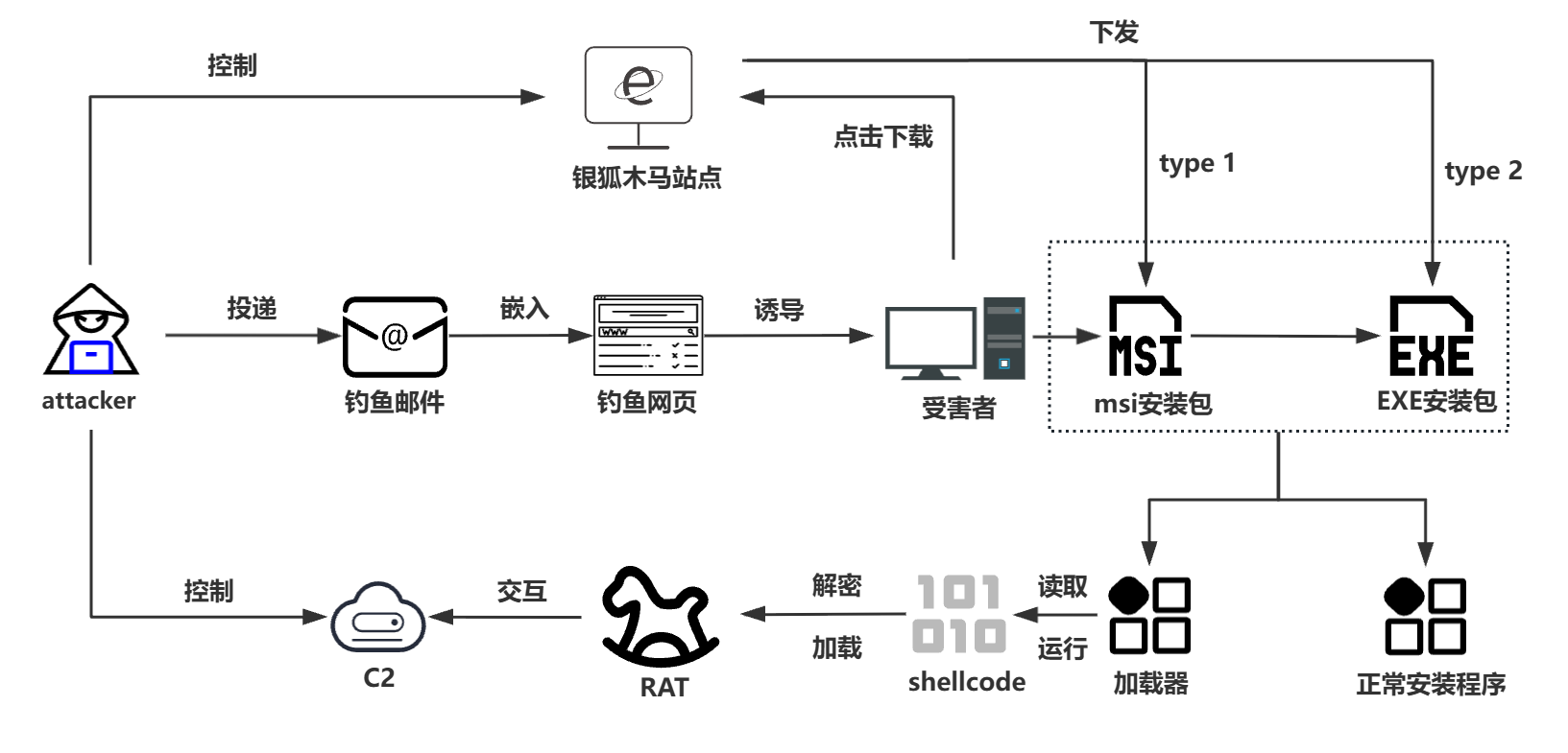 近年来,多个黑客组织通过仿冒常用工具下载页面,SEO优化以及仿冒国家重要单位网站[[1]](https://mp.weixin.qq.com/s/Yq8HVnG0N_ogOaLv2JI12g)等手段分发银狐木马,正逐步吞噬整个中文互联网的野生下载环境,其中典型的攻击链如下图所示: