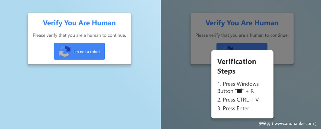例如,某些攻击页面会伪装成验证码验证界面。用户点击“验证码”后,页面会悄悄将恶意代码写入剪贴板,并提示用户为了验证身份,将其粘贴到 Windows 的“运行”窗口中。
