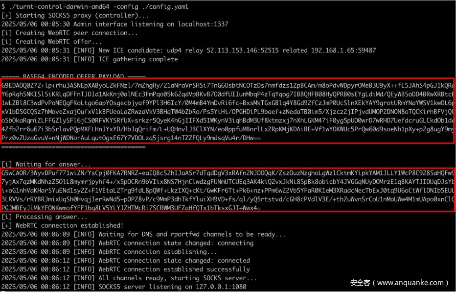 Controller 运行一个 SOCKS 代理服务器,用于接收通过 TURN 隧道传输的连接。Relay 使用 TURN 凭据连接回 Controller,并通过提供商的 TURN 服务器建立 WebRTC 数据通道。