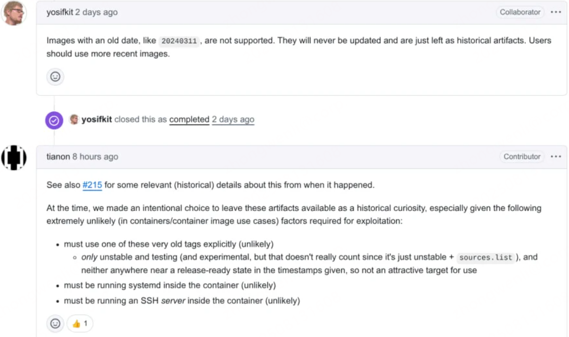 Debian 解释称,他们有意保留这些镜像作为历史档案,并建议用户只使用最新镜像,不要拉取旧版本。维护者认为,该漏洞的利用条件较苛刻,例如需要容器内安装并运行 sshd 服务、攻击者能够访问容器的 SSH 服务端口、且持有与后门触发逻辑匹配的私钥。