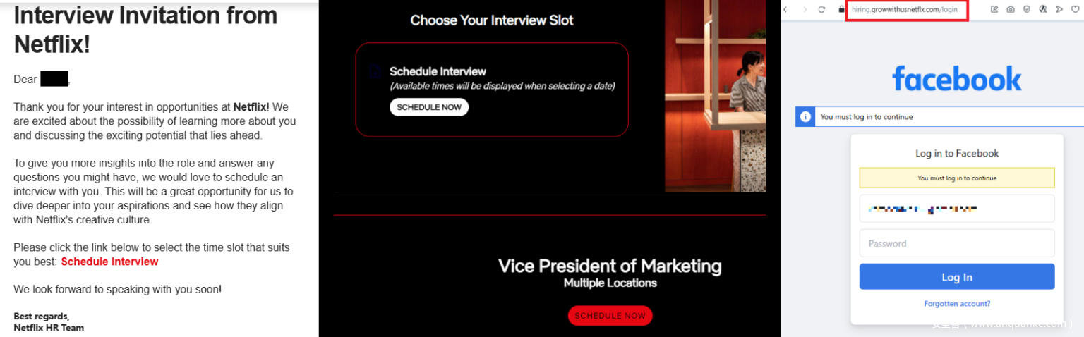安全研究人员近日警告称,一种利用虚假Netflix招聘信息的新型网络钓鱼骗局正针对求职者实施攻击,诱骗他们泄露Facebook账户登录信息。