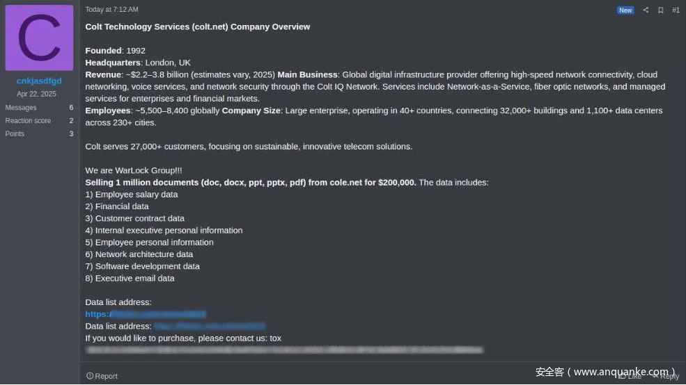 一名使用别名 “cnkjasdfgd” 的威胁行为者声称自己是 WarLock 勒索软件团伙成员,并宣称此次攻击由其实施,同时开价 20 万美元出售一批据称从 Colt 窃取的 100 万份文件。