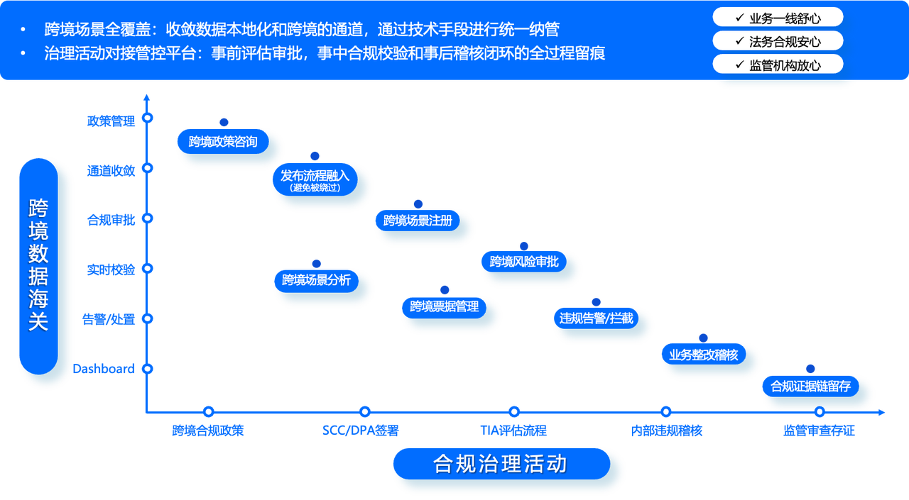 这套跨境合规管控平台,通过集中梳理和收敛数据跨境场景,建立不可绕过的合规跨境通道,整合统一的 TIA(Transfer Impact Assessment)平台,向业务团队、法务合规和审计人员提供“一站式”的合规跨境服务;同时通过技术手段确保跨境合规审批与实际跨境数据的强一致性,让所有跨境行为“合规”“透明”和“可控可管”。