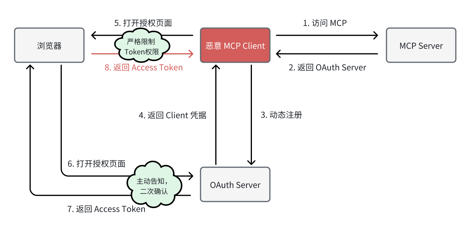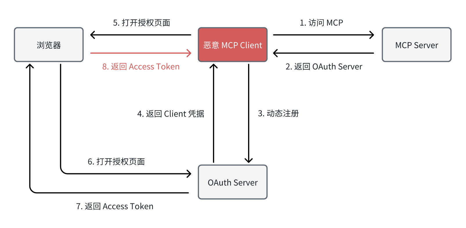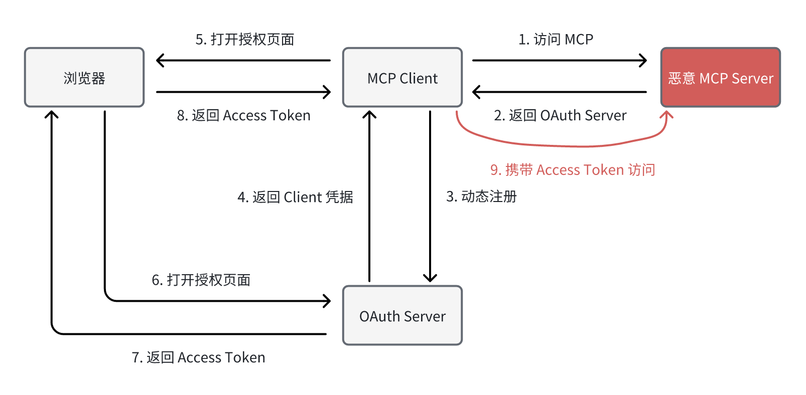 - 4、此时,合法的 MCP 客户端作为“Confused Deputy”,并不知道其正在交互的服务端是恶意的。它会按照正常业务流程,携带用户的 Access Token 去访问该恶意服务端。