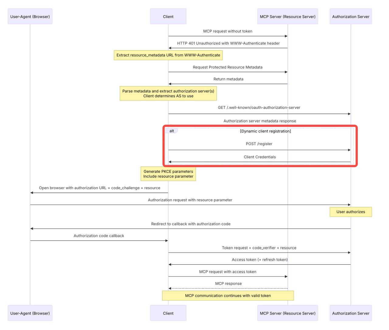 为了支撑这种高度灵活的接入模式,服务端无法像传统应用那样预先静态注册所有客户端。因此,MCP 官方文档采用了 OAuth 2.0动态客户端注册协议(RFC 7591)。该协议允许客户端在 OAuth 授权流程中,通过向一个标准的 /register 端点发起请求,动态地获取合法的客户端凭证(client_id, client_secret)。这免除了开发者在授权服务提供商处进行繁琐的手动预注册流程,极大地降低了接入成本。
