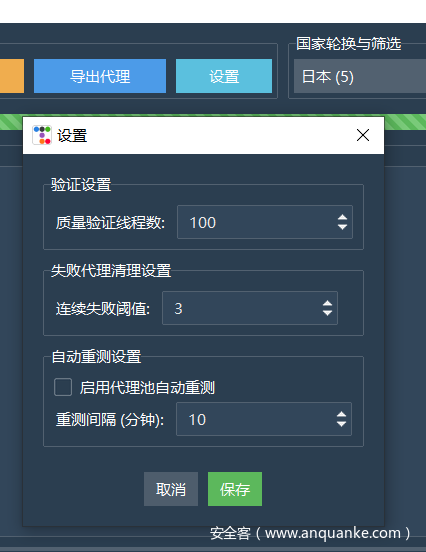 在检验代理是否可用时可以取消验证防止卡死;全部测试就是将已经在代理列表中的IP进行再次检验;还可以导出可用代理;在设置中设置验证线程数,失败代理清理设置以及自动重测设置。