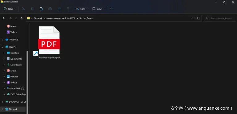 进入资源管理器后,受害者被引导至攻击者控制的SMB共享,其中包含伪装成”Readme Anydesk.pdf“的快捷方式LNK文件。点击该文件即触发下一阶段攻击。