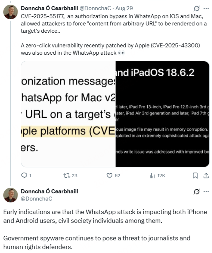 加拿大多伦多大学公民实验室(Citizen Lab)的安全研究员 Bill Marczak 在 X 平台上指出,该漏洞在攻击链中扮演了零点击投递通道的角色。完整攻击过程结合了 CVE-2025-43300——这是苹果 Image I/O 框架中的一个零日漏洞,苹果已于本月修复。该漏洞可通过在图像文件中嵌入恶意代码来攻陷设备,而 WhatsApp 的漏洞正好为攻击者提供了一个可静默加载并显示恶意图像的完美入口。