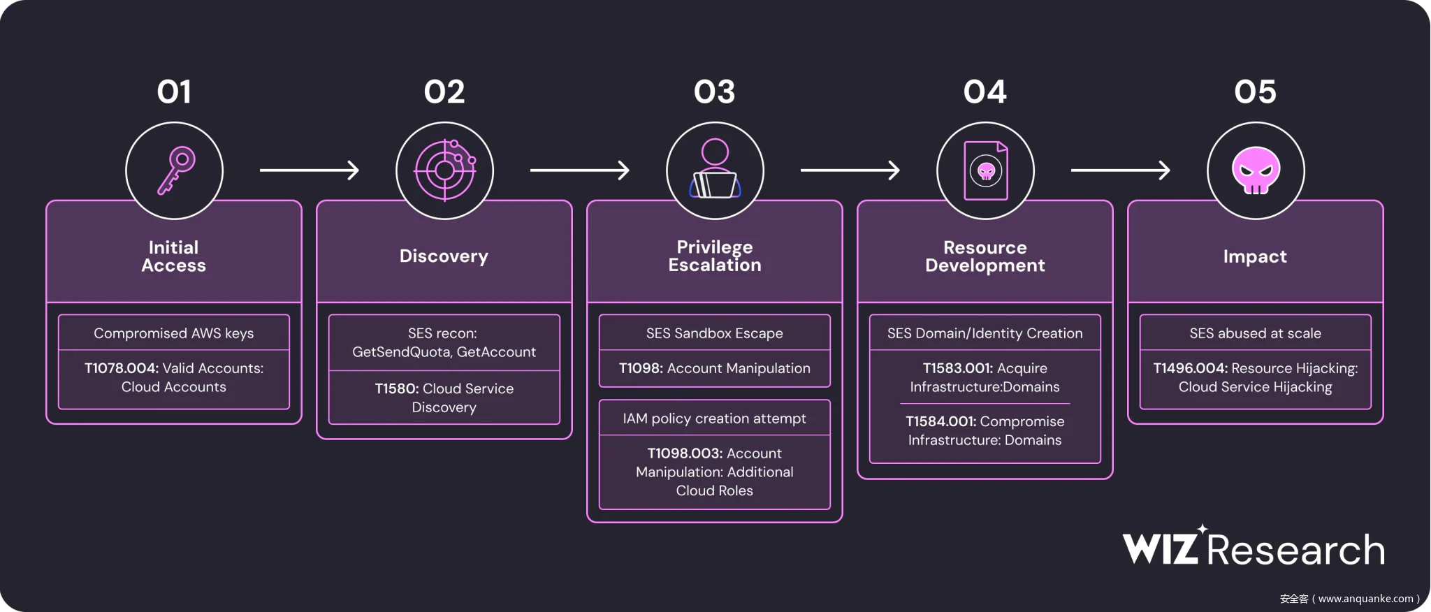 Wiz总结:“SES滥用很少孤立发生。它明确表明攻击者已控制有效的AWS凭证,而这些凭证可能被用于实施更具破坏性的行动。”