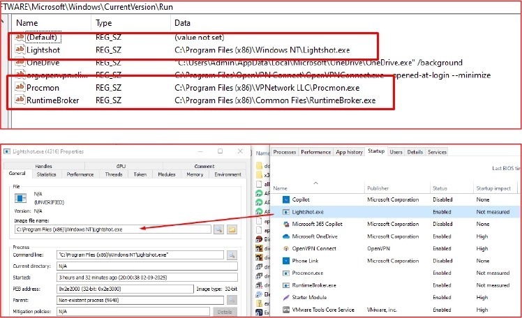 该威胁通过注册表运行项和计划任务实现持久化,创建如RuntimeBroker、Lightshot等名称的条目,在用户登录时执行,并每三分钟重复运行一次,持续较长时间。