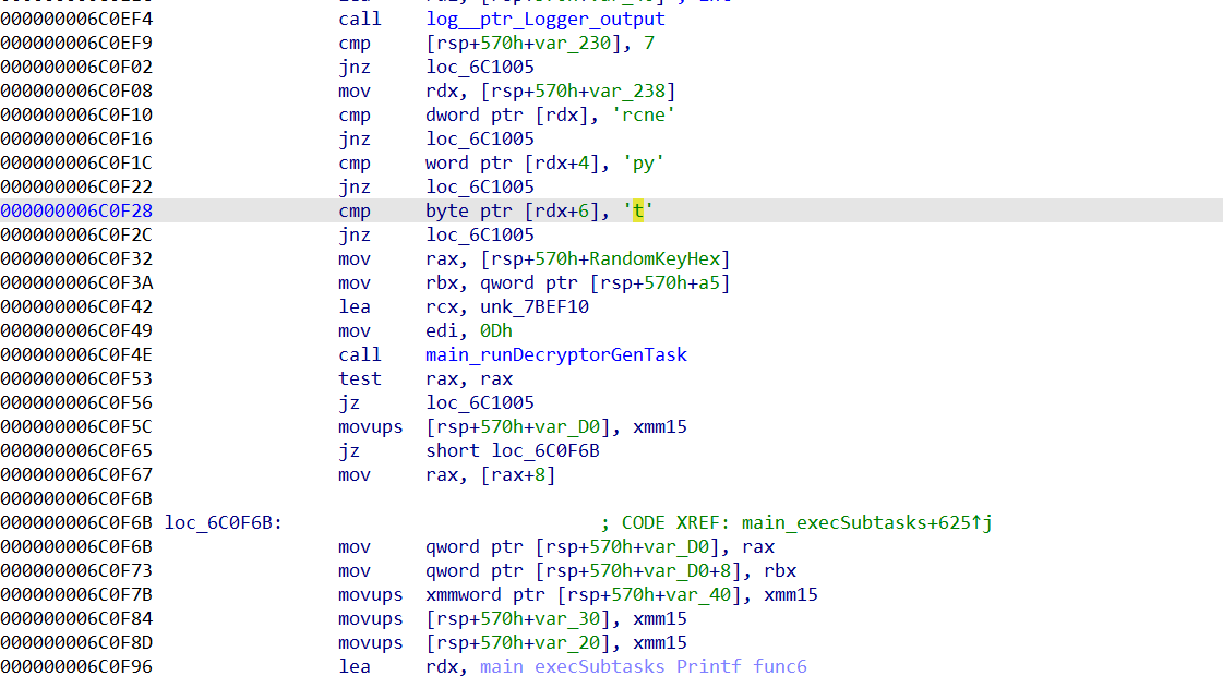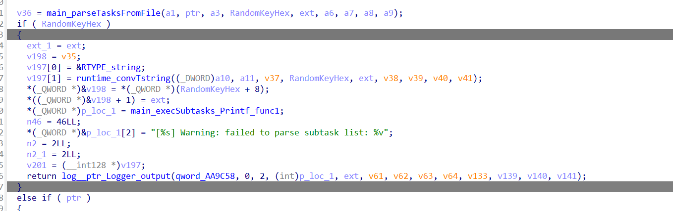 main_execSubtasks):从文件加载任务;当类型为 encrypt 时调用main_runDecryptorGenTask对密钥进行 RSA 加密后写入 txt,再继续下发并执行恶意任务。 - 密钥处理(