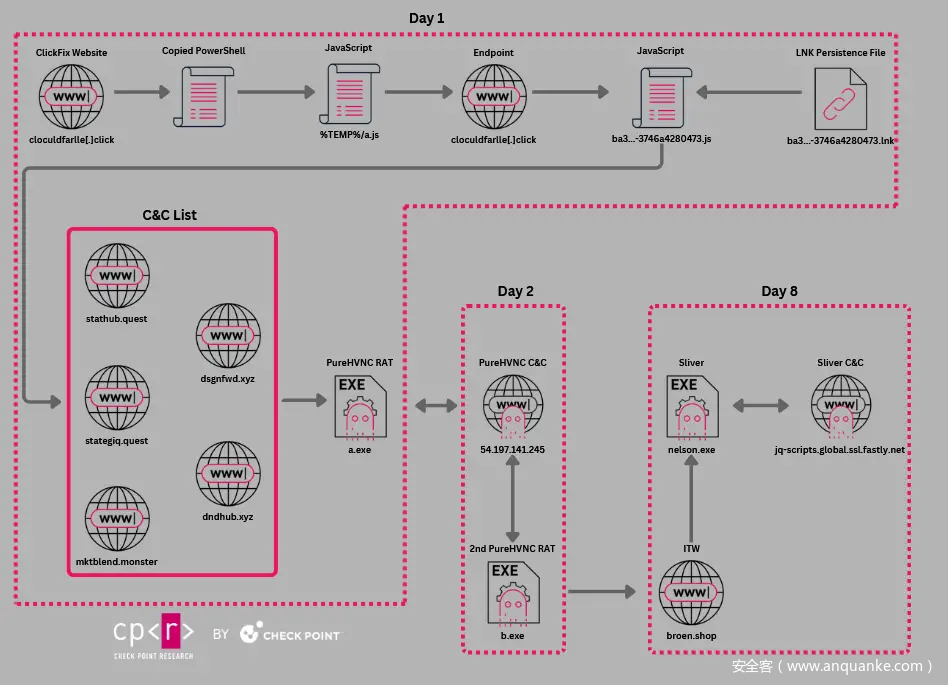 Check Point Research(CPR)近期的 forensic 调查揭示了Pure恶意软件家族的细节——这是由威胁 actor “PureCoder” 开发并销售的一系列恶意工具。研究聚焦于一场ClickFix钓鱼活动,该活动导致了为期八天的入侵,攻击者部署了Rust加载器、PureHVNC RAT和Sliver C2框架,以维持持久化并窃取敏感数据。