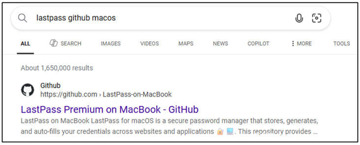 据LastPass披露,攻击者利用搜索引擎优化(SEO)技术,将恶意GitHub Pages推至谷歌、必应等平台搜索结果顶部。这些页面谎称提供来自可信厂商的合法macOS软件,用户访问后会被重定向至一系列恶意网站,最终通过伪装的安装脚本交付Atomic stealer。