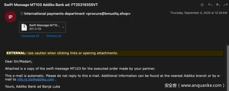 攻击者使用了极具说服力的社会工程学手段。TRU表示:“钓鱼诱饵由procure@bmuxitq[.]shop发送,主题为‘Swift Message MT103 Addiko Bank ad: FT2521935SVT’,邮件正文设计成看似合法的财务 correspondence。”附件中包含DarkCloud 3.2版本,伪装成Swift交易文件。