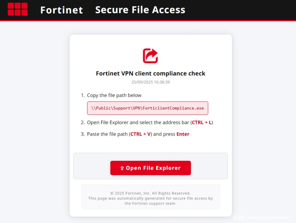 这项新型攻击活动将自身伪装成Fortinet VPN合规性检查工具,专门利用企业对远程访问基础设施的信任,进而入侵企业网络。