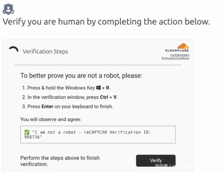 ClickFix攻击将恶意意图隐藏在看似正常的浏览器安全检查背后。访问钓鱼页面的受害者会被要求进行”人类验证”——通常通过点击触发验证码或验证流程的按钮实现。