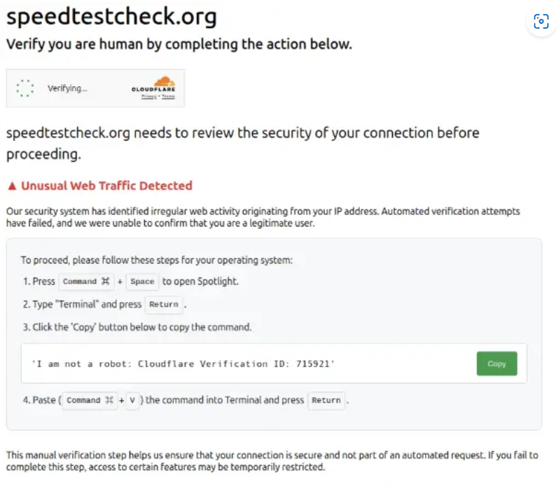 幕后操作中,该点击动作会将恶意命令复制到受害者剪贴板。随后弹出的提示会引导用户打开终端(PowerShell或macOS终端),粘贴复制命令并执行”以完成验证”。这使得用户成为自身设备感染的”共犯”。