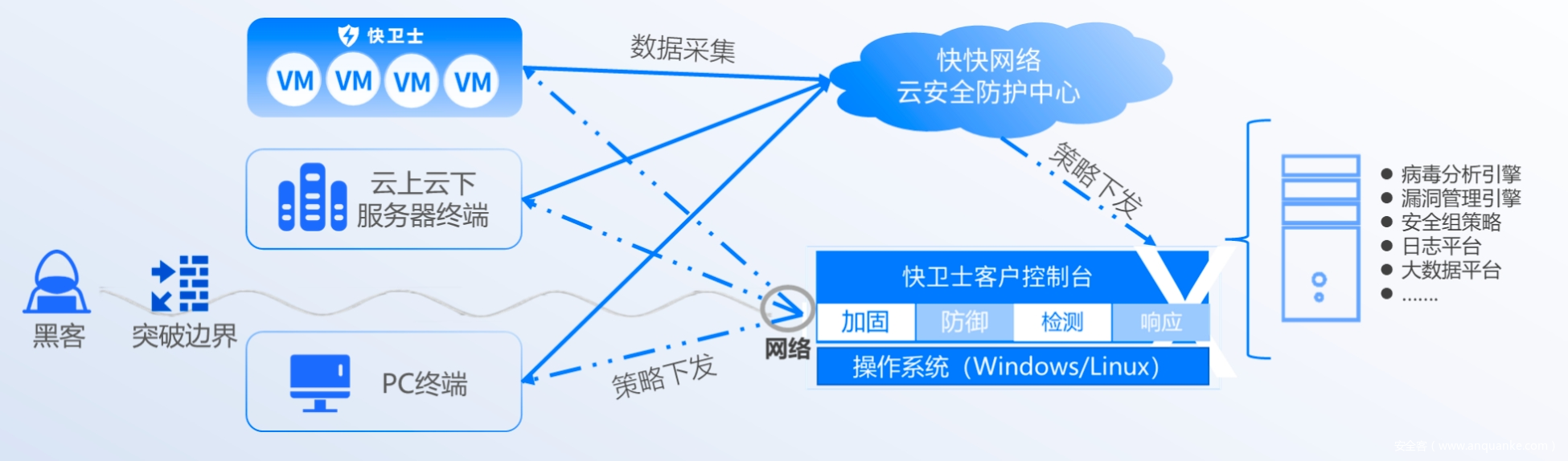 快卫士终端安全系统深度融合实时检测、智能分析与动态风险预警能力,构建覆盖“入侵前-入侵中-入侵后”的全生命周期防护体系。即使在Windows 10停止官方维护后,仍可为企业提供持续、闭环的终端安全运营保障,全面覆盖云上云下服务器及办公PC终端。