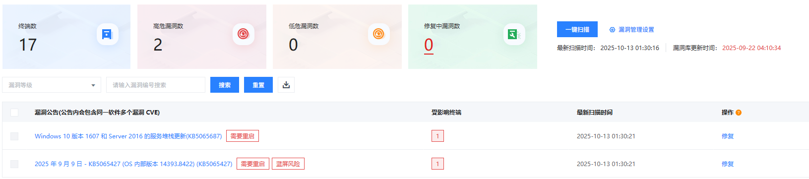快卫士突破传统终端安全产品在漏洞扫描与修复中的常见瓶颈,提供完整的漏洞扫描支持,具备漏洞影响分析、修复优先级评估与可视化展示能力。系统依据修复逻辑智能推送补丁序列,并支持一键修复操作,确保在Windows 10停服后仍具备持续、可靠的漏洞检测与修复能力。