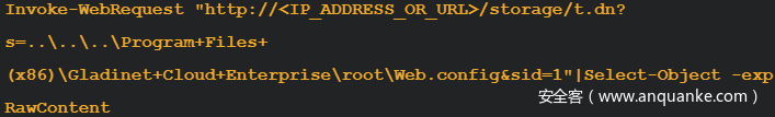Huntress发布了一行PowerShell Invoke-WebRequest示例,展示未认证请求如何通过/storage/t.dn?s=... 检索Web.config 。