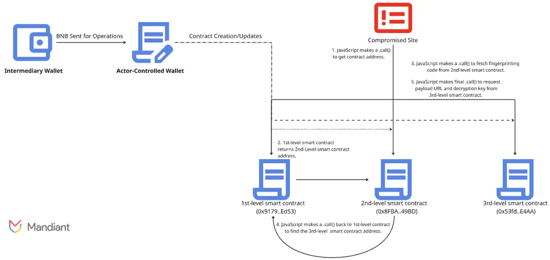 Mandiant和GTIG表示:“自2023年底以来,UNC5142显著改进了其战术、技术和流程(TTPs),以增强运营安全性和规避检测能力。”该集群滥用一种名为EtherHiding的方法,“通过将恶意代码或数据存储在公共区块链(如BNB智能链)上来隐藏它们”。