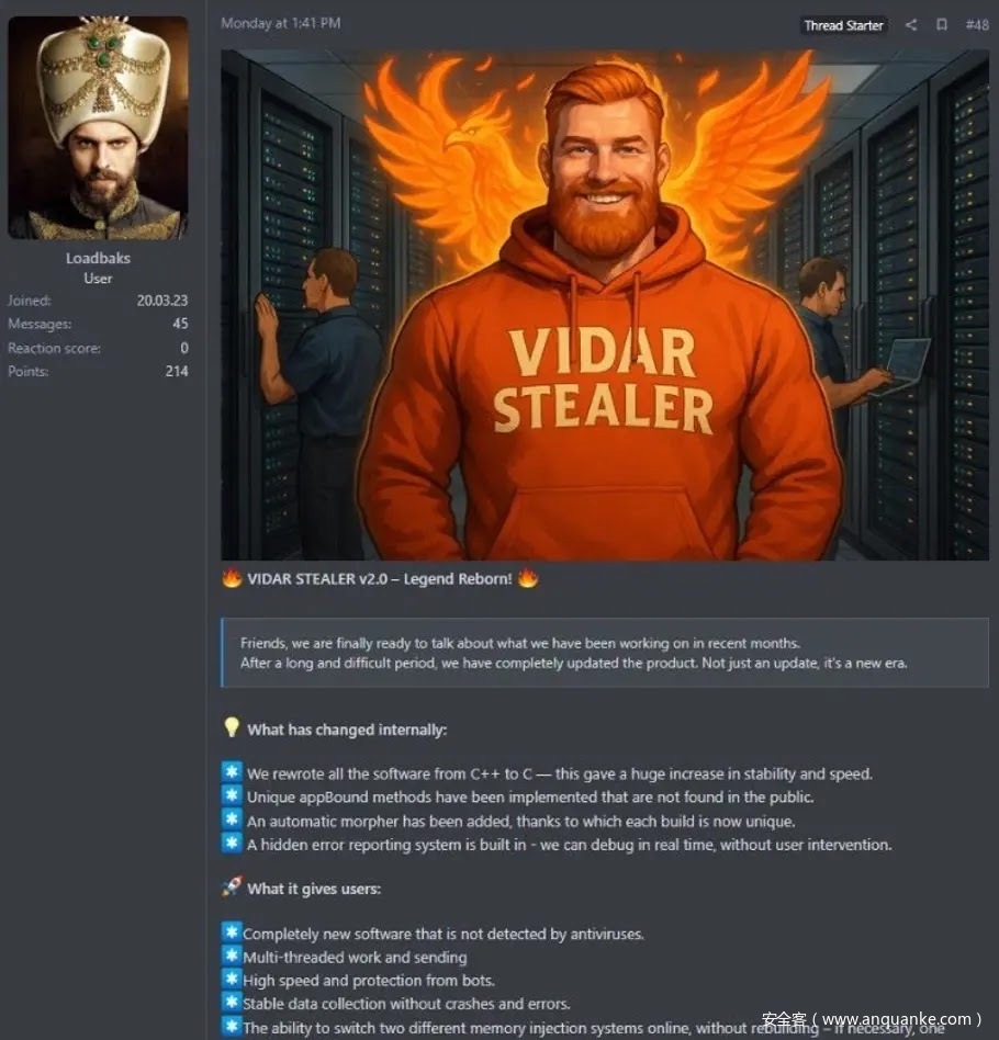 该新版本由开发者“Loadbaks”于2025年10月6日在暗网论坛发布,从C++完全重写为纯C语言,采用多线程架构,显著提升数据外渗速度和规避能力。