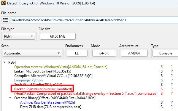 这款Python RAT最初是在威胁狩猎活动中被发现的,它是一个用PyInstaller编译的68.5 MB可执行文件。