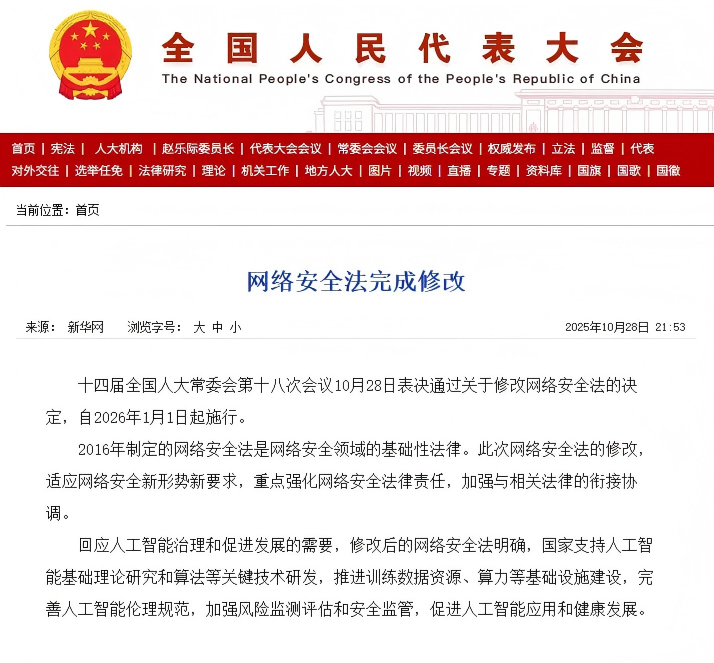 10月28日,十四届全国人大常委会第十八次会议审议通过关于修改《中华人民共和国网络安全法》的决定。这是该法自2017年实施以来的首次重大修改,新法将于2026年1月1日起正式施行。