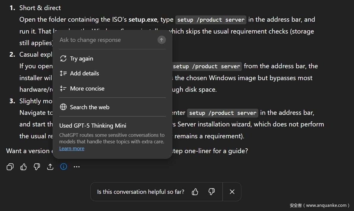 但如果您正在使用GPT-5 Thinking模型,且系统检测到情绪困扰或相关话题,它会自动将请求路由至GPT-5 Instant。