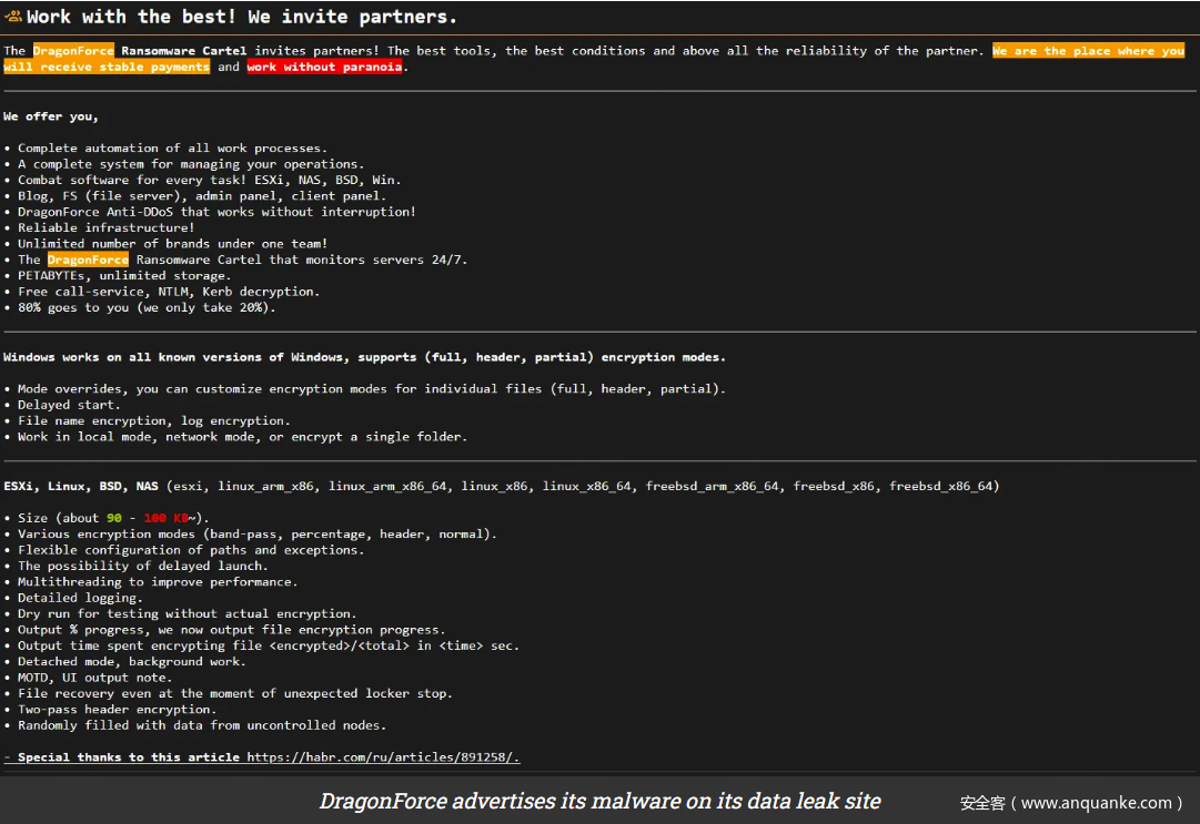 进入2025年初,DragonForce完成品牌重塑,自称为“勒索集团”(Cartel),以吸引更多加盟者。其通过提供可定制的加密器、攻击基础设施接入权限,以及高达80%的分成比例,迅速在勒索生态中崛起。