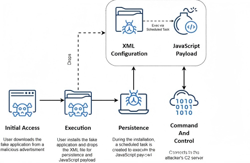 报告解释:“此变体仅使用计划任务实现持久化……配置为每 24 小时运行一次 JavaScript,并带有随机延迟。”这确保高度混淆的 JavaScript payload 能 隐蔽且可靠地执行。
